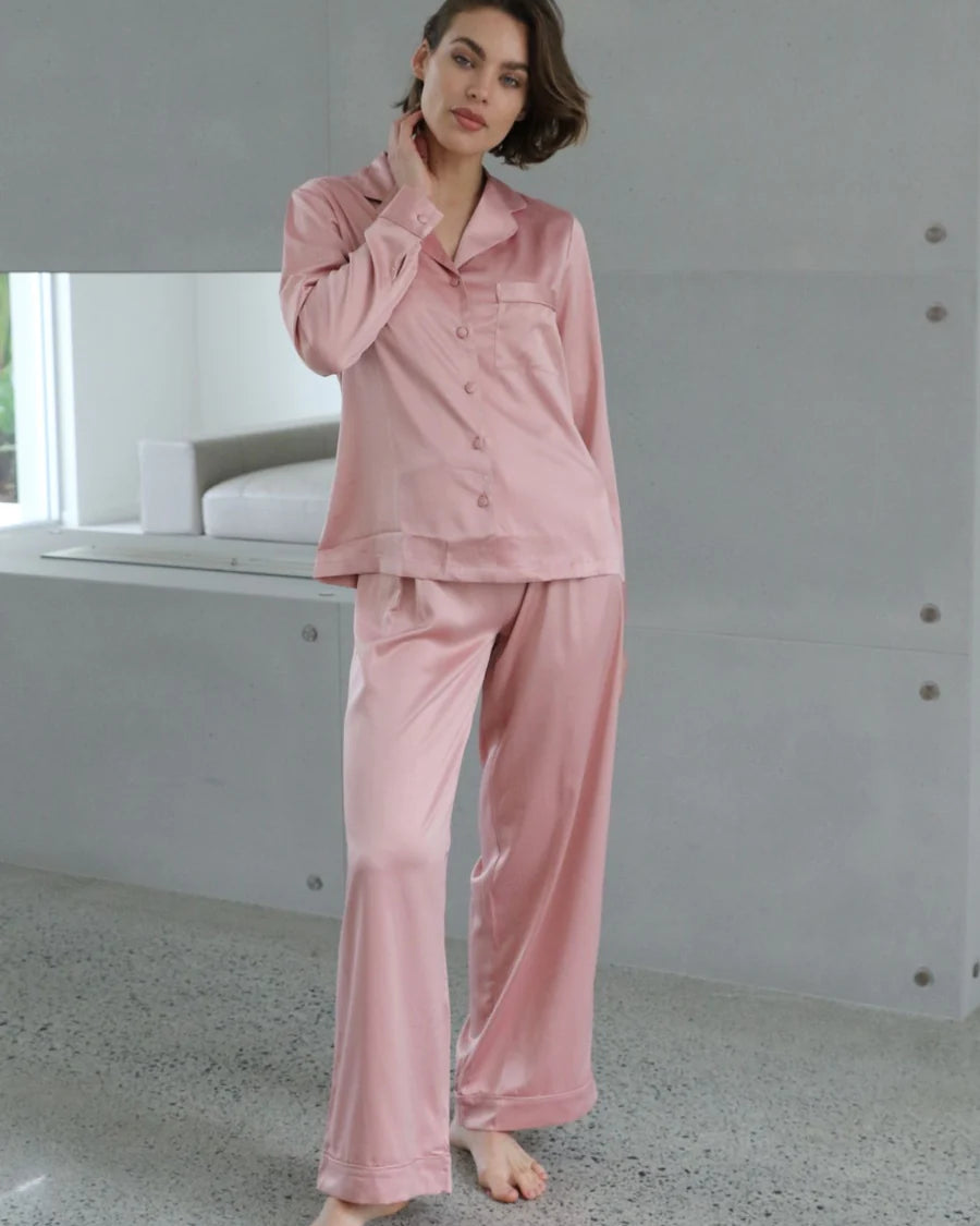 The homebodii® Toni Satin PJ Lounge Set – a classic take on glamorous long-sleeved matching satin pyjamas designed for dreamy comfort on hot days. With self-colour piping detail and an adjustable waistband, this timeless duo ensures breathability and the coziest sleeps. Versatility is key; pair it with sandals for a laid-back vibe that's perfect for both nights in and nights out on the town. Personalise your set with our complimentary personalisation service to make it uniquely yours. Elevate your summer loungewear with the breathability and chic style of the Toni Satin PJ Lounge Set.
