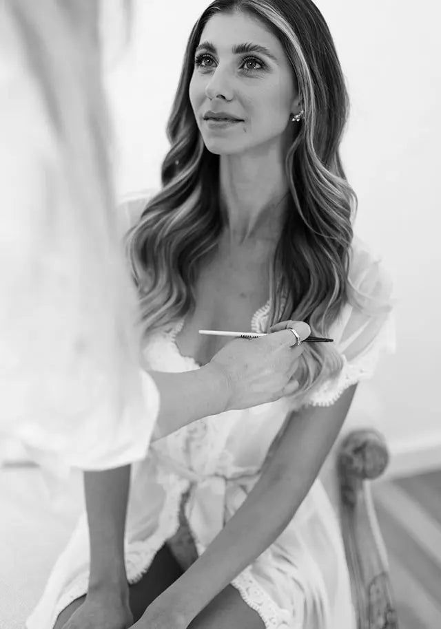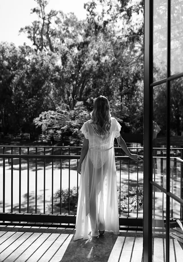 Style note: To get ready the bride wore our Ingrid Bodysuit in white and romantic Farrah Long Lace Chiffon Robe. Lori's bridesmaids wore matching Homebodii Jasmine Robes in blush satin.