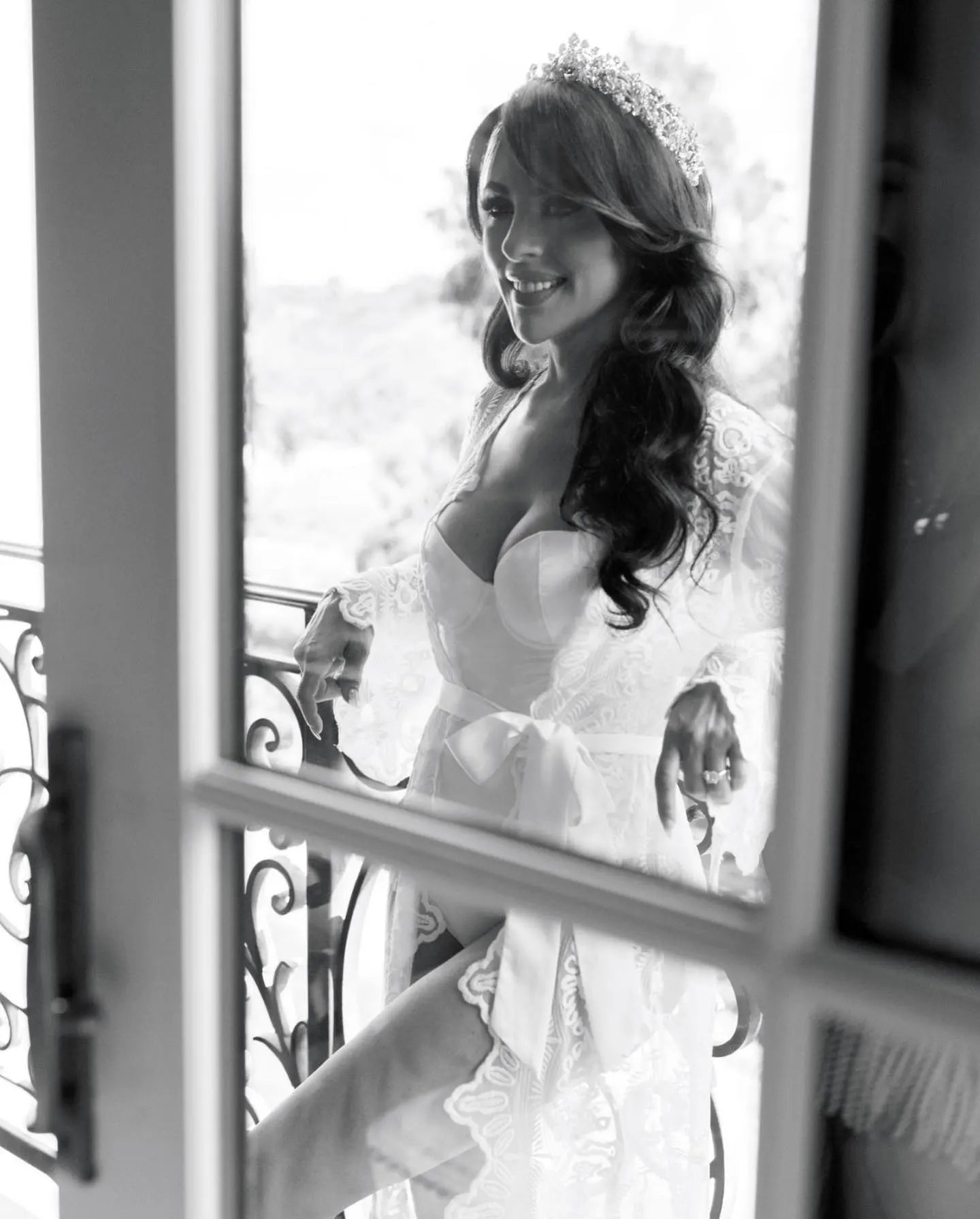 Vanessa wearing our stunning Homebodii Madonna Lace Bridal Robe over top of a Homebodii Brooklyn Bodysuit.