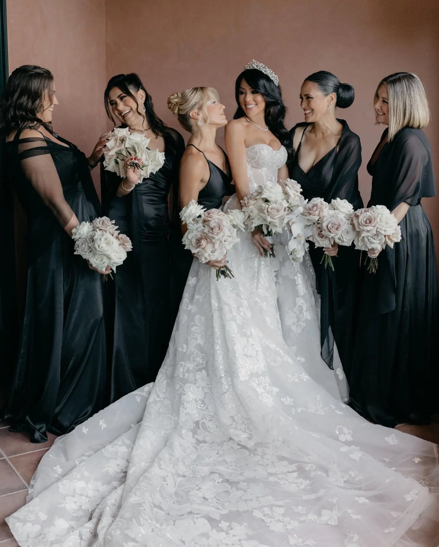 Vanessa alongside her gorgeous bridesmaids as they lounge in the Olivia Robe in the shade Blush.