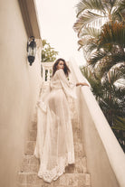 The silhouette features flowing kimono-style sleeves and a soft satin waist sash that defines the figure while keeping an effortless sense of ease. Intricate lacework frames the neckline, cuffs, and hem, creating a gentle contrast against the airy dotted tulle. Designed in Australia, the Chloe Robe captures the essence of bridal luxury — understated yet unforgettable.