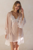 Delicate lace trim graces the sleeves and hem, adding an element of timeless romance, while the self-tie waist allows for a flattering, adjustable fit. Whether you're starting your morning routine or unwinding in the evening, this robe is the perfect blend of sophistication and ease.