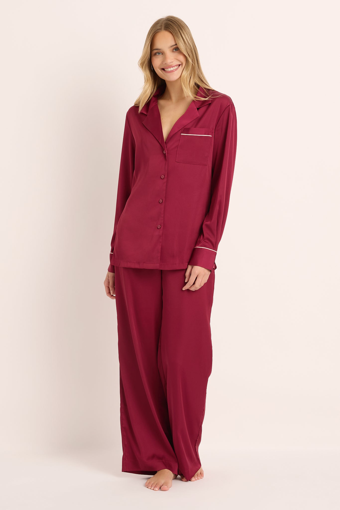 Crafted from our signature premium non-crush satin, the fabric drapes like silk and feels sumptuously soft against the skin, while its subtle sheen adds a festive glow. Whether you're unwrapping gifts by the tree or enjoying a quiet night in, the Grace Pyjama Set promises effortless sophistication from dusk till dawn.