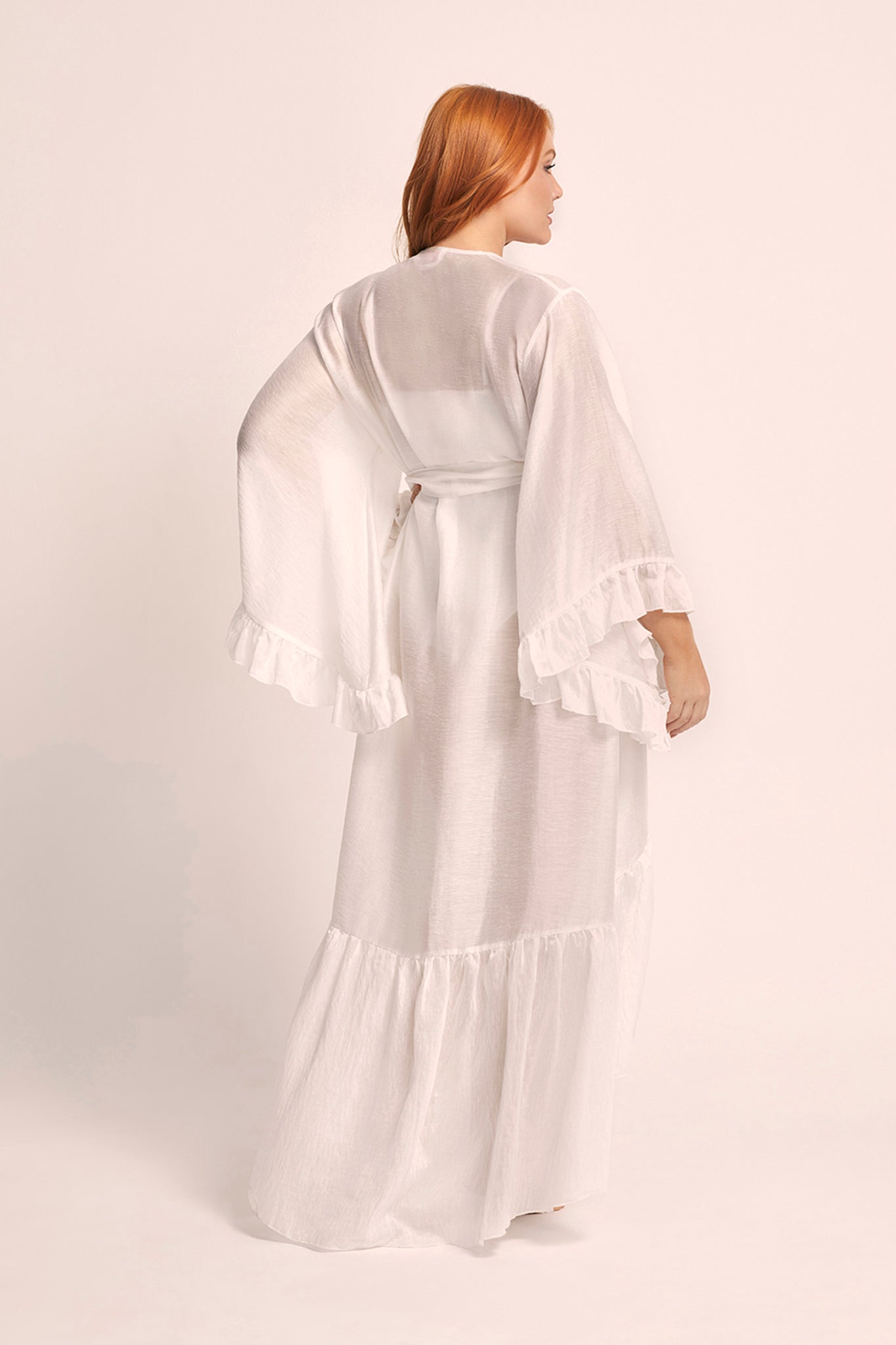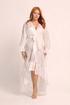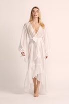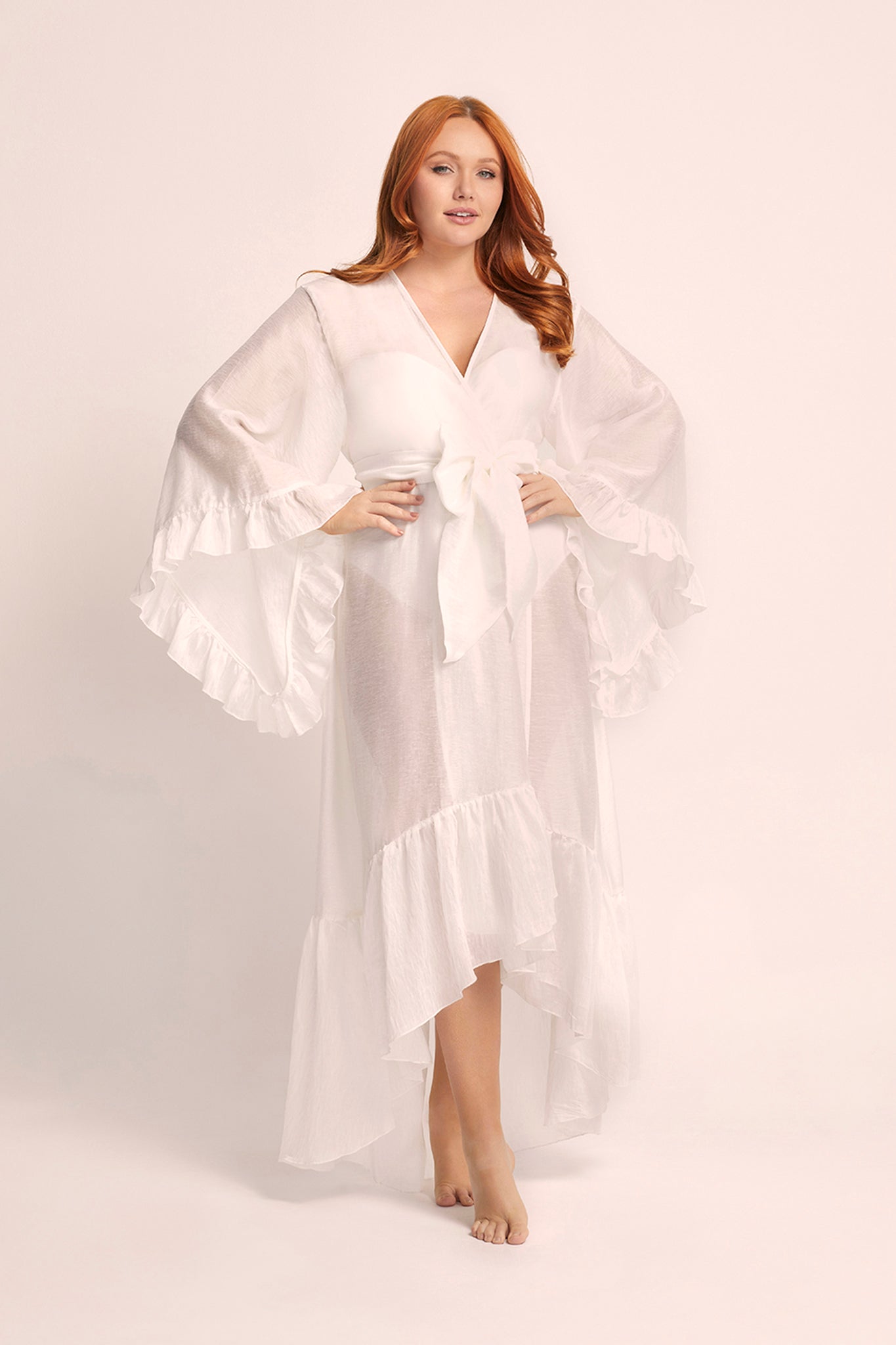 For the days when you crave an airy, flirty touch, Homebodii's 'Gaylene' robe is your ideal choice. Its charming accentuated ruffles and graceful flow create a distinctive and stylish look, whether you're lounging by the pool, strolling along the beach, or if you're a discerning bride seeking a statement piece for your big day and beyond.