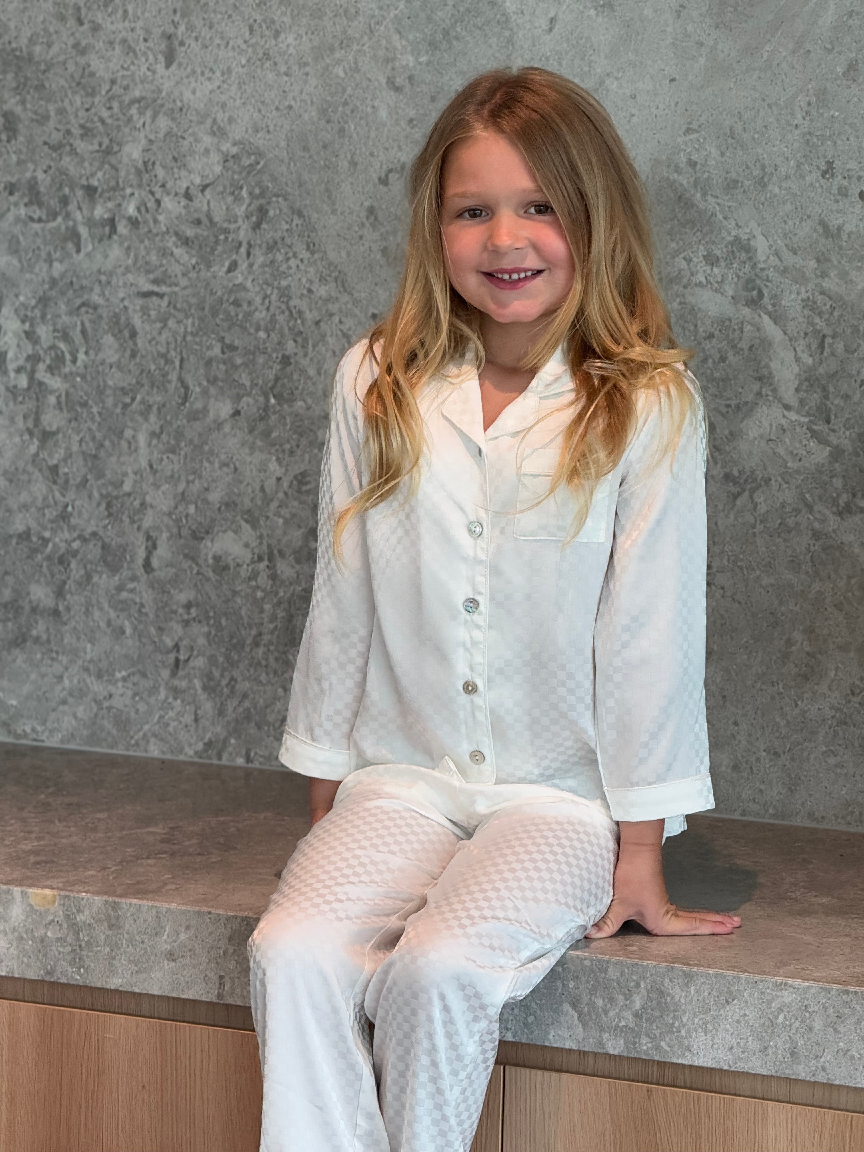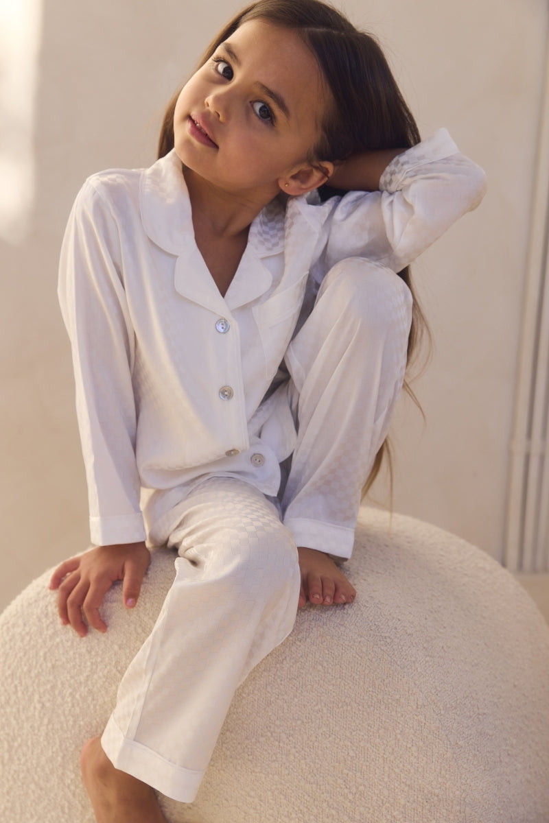 Elevate your child's bedtime with our Gigi Checked Satin Kids Pyjama Set, crafted from OEKO-TEX® certified satin, offers a luxurious feel while ensuring sustainability and safety, free from harmful substances—perfect for comfortable, eco-conscious elegance.