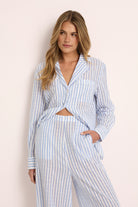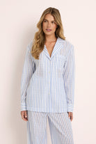 The classic button-up shirt drapes naturally over the body, complemented by wide-leg lounge pants that offer ease of movement and timeless elegance. Designed in a refreshing blue-and-white stripe, the Vienna brings an air of coastal serenity to everyday wear — perfect for slow mornings, travel, or laid-back afternoons in the sun.