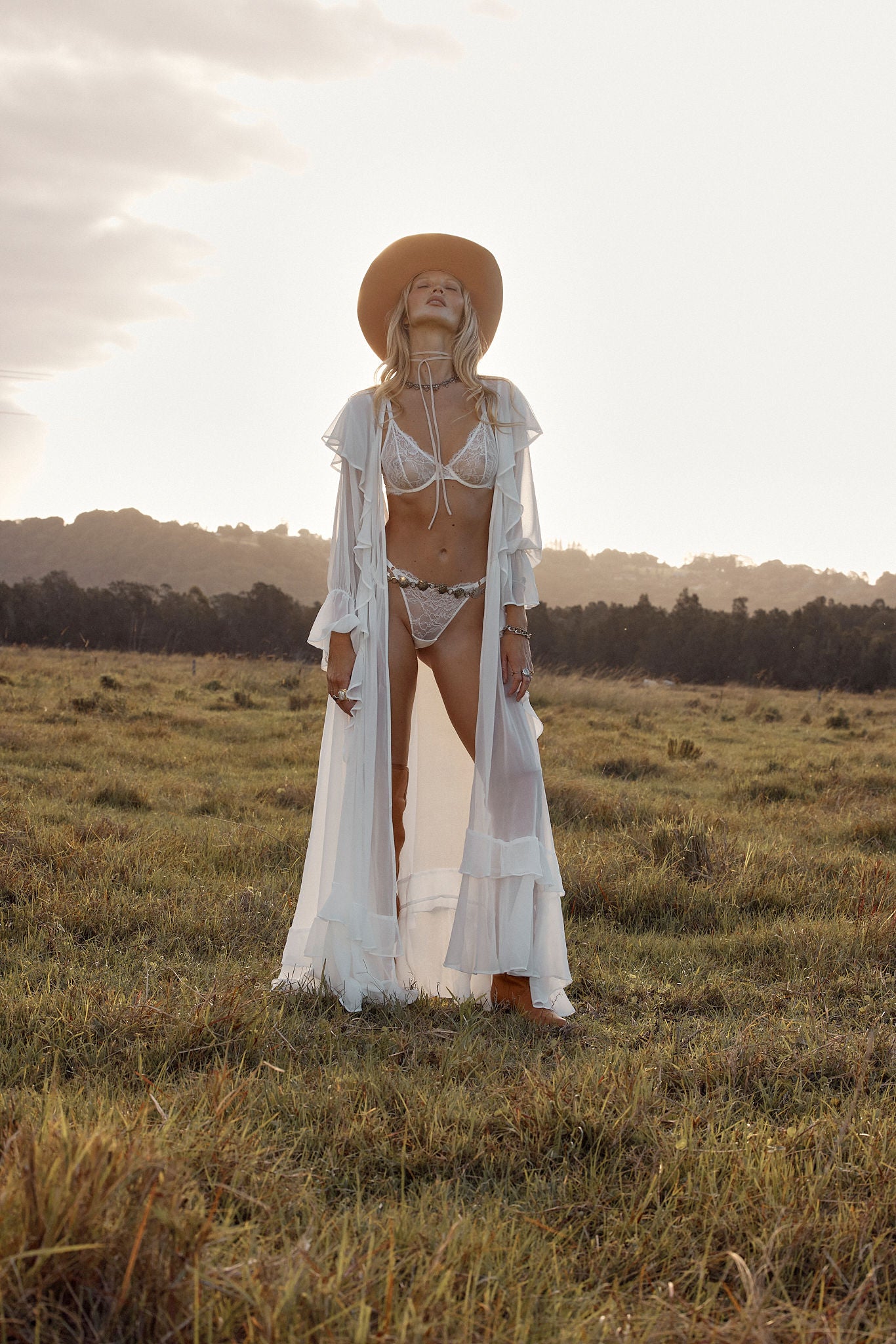 The Persephone Robe by Homebodii is a stunning and feminine style that exudes elegance, making it the perfect choice for springtime. Crafted from a soft and sheer chiffon fabric, this robe offers a delicate and luxurious feel.