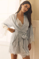 Delicate lace trim graces the sleeves and hem, adding an element of timeless romance, while the self-tie waist allows for a flattering, adjustable fit. Whether you're starting your morning routine or unwinding in the evening, this robe is the perfect blend of sophistication and ease.
