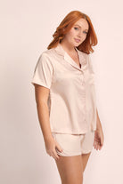 Experience the perfect fusion of timeless sophistication and unparalleled comfort with homebodii®'s Toni short sleeve satin pajama set. The self-colored satin buttons add a touch of vintage Hollywood glamour, evoking a sense of classic elegance. Meanwhile, the elasticized shorts are thoughtfully designed to ensure you have the most dreamy and comfortable sleep.