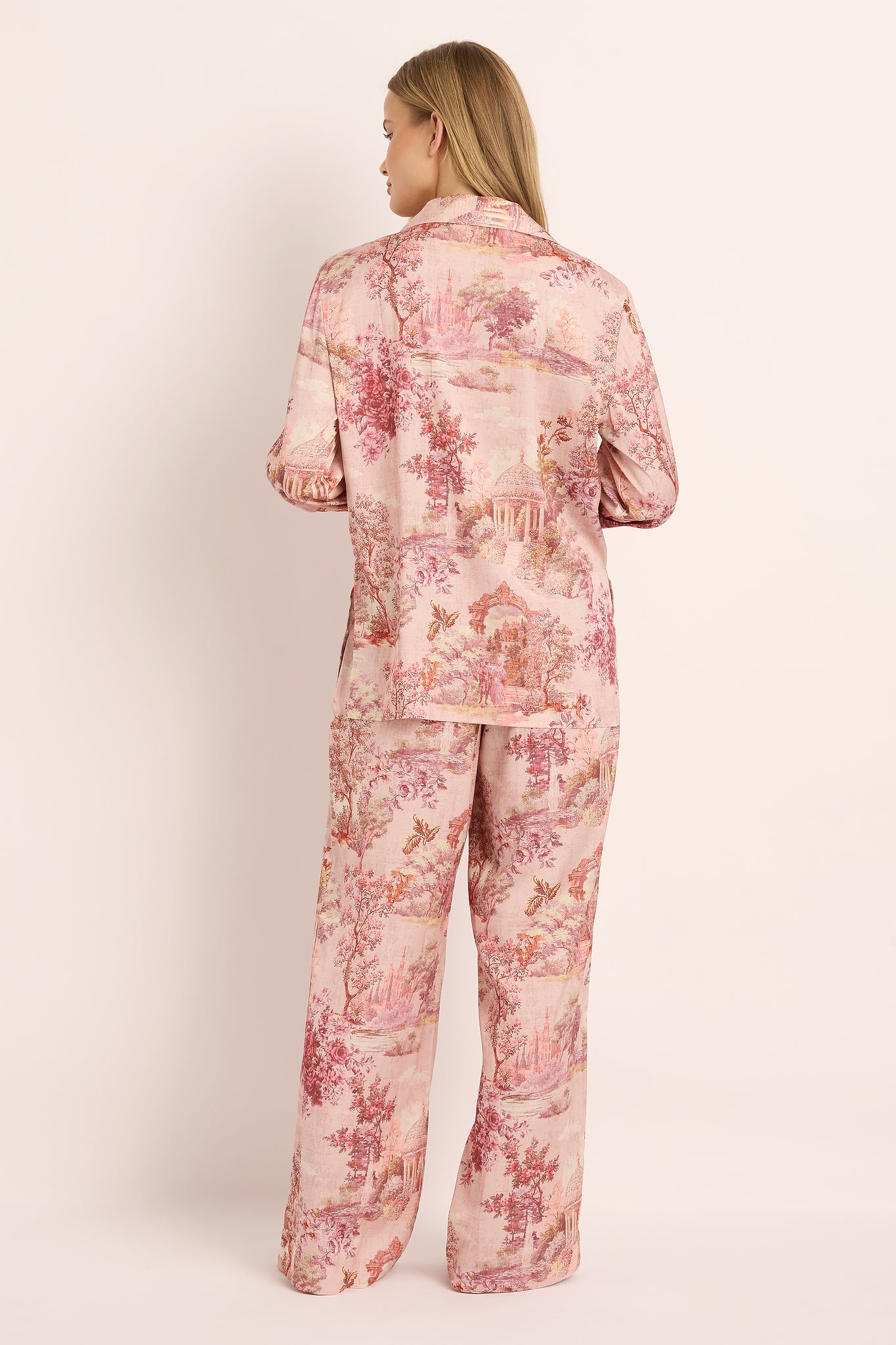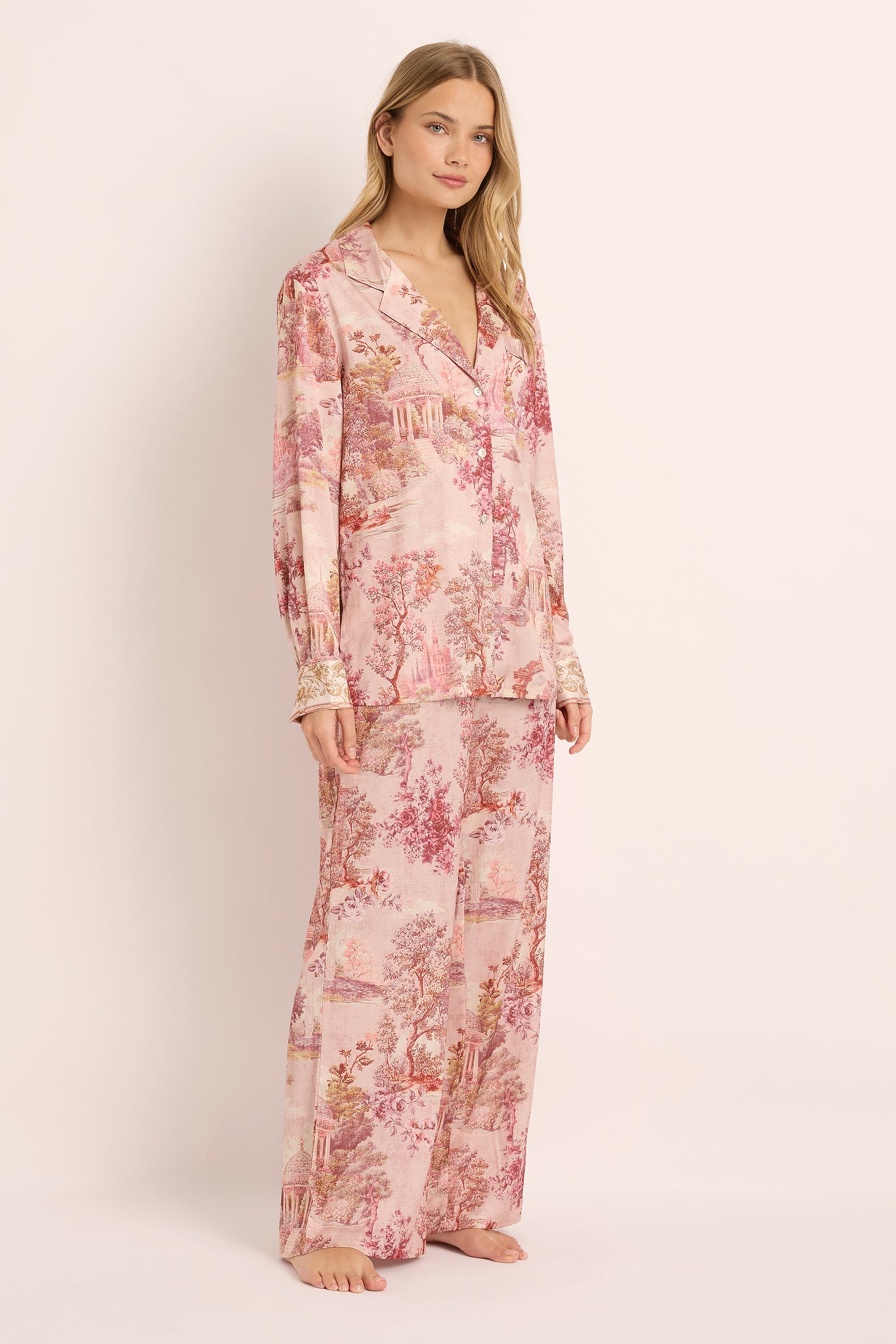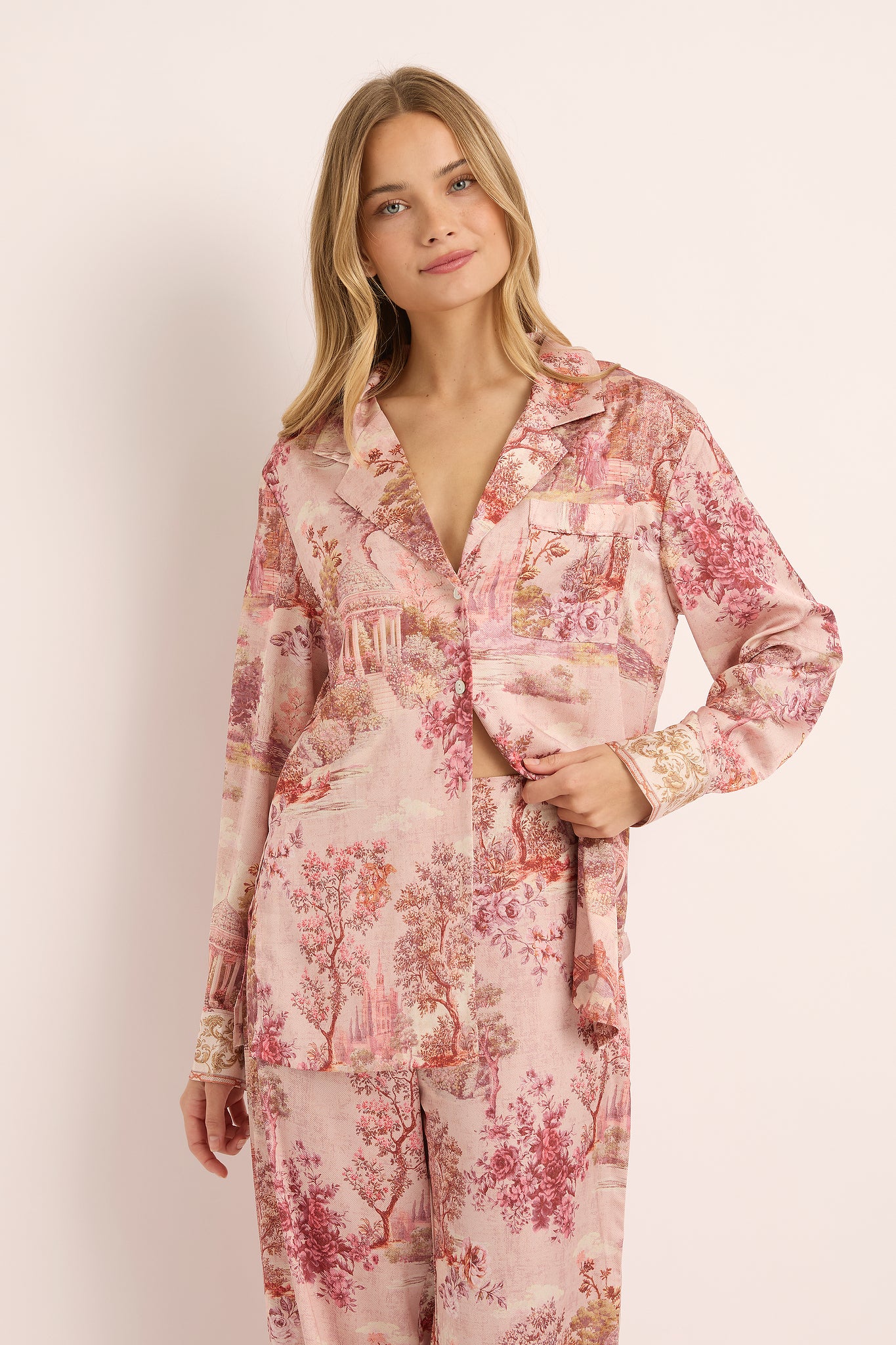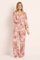Inspired by the charm of the French countryside, the Toulouse Long Sleeve Lounge Pyjama Set blends comfort and artistry in perfect harmony. Its exclusive toile-inspired print evokes the elegance of vintage European scenes—a soft symphony of blush tones and delicate detail designed for dreamers and romantics alike.