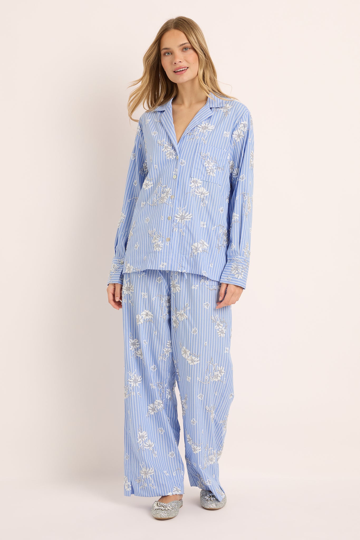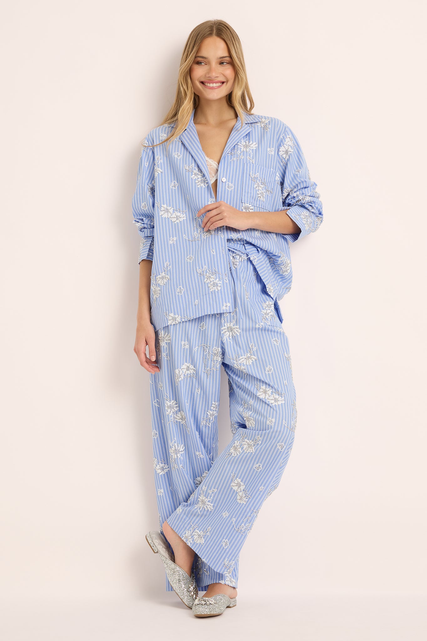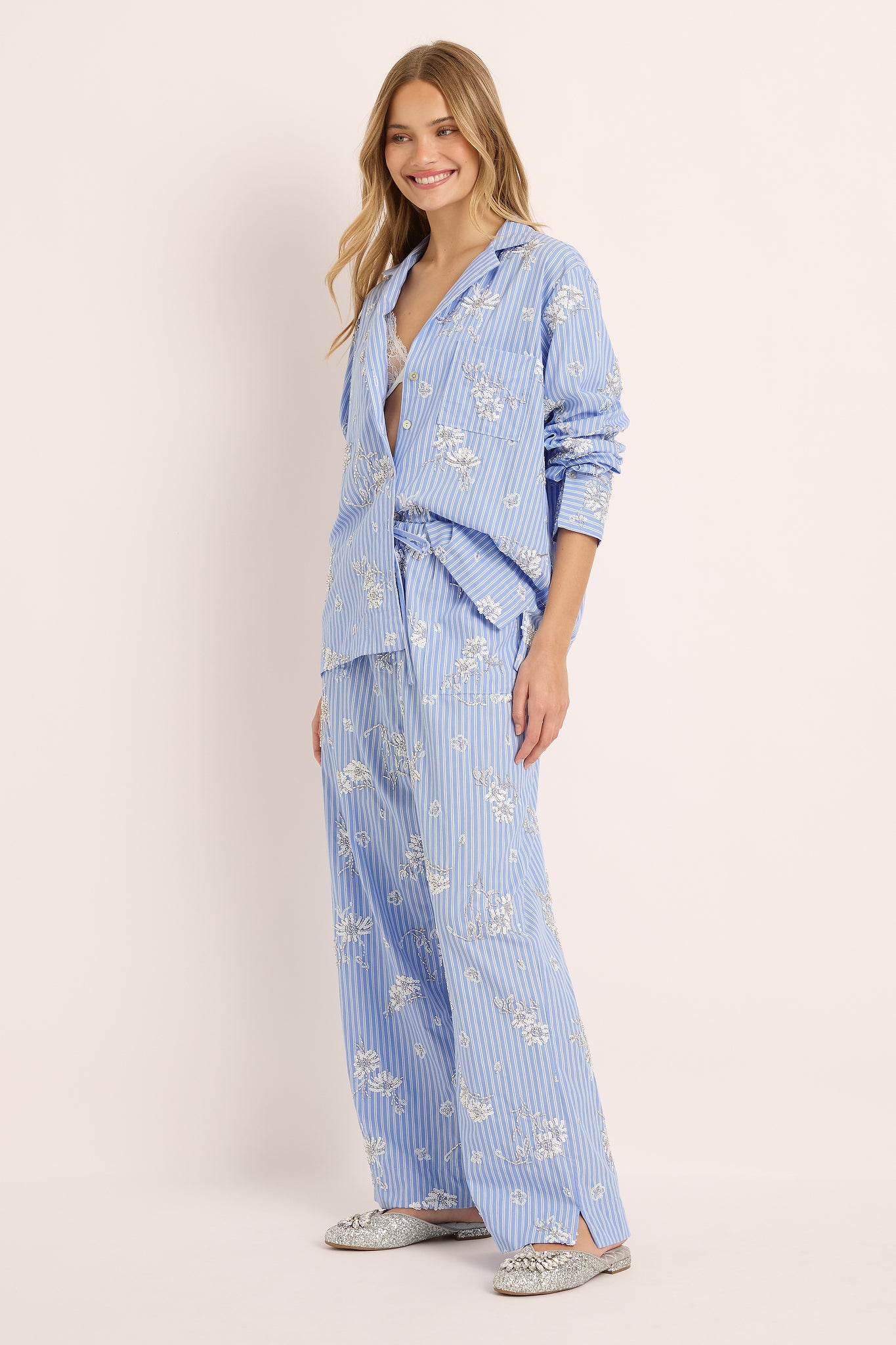 The Homebodii Vivienne Beaded Lounge Set is where timeless craftsmanship meets modern femininity. Made from 100% cotton, this soft blue striped set is adorned with delicate hand-beaded embellishments, transforming everyday comfort into a true statement of style.